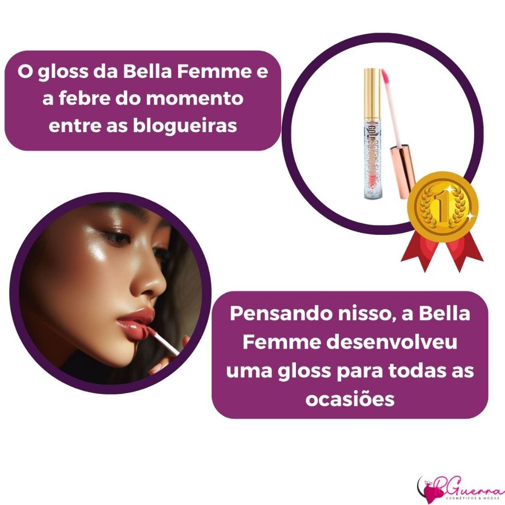 Descubra a magia do Gloss Mágico Golden Bella Femme! Este brilho labial luxuoso oferece um acabamento de alto brilho que dura o dia todo.