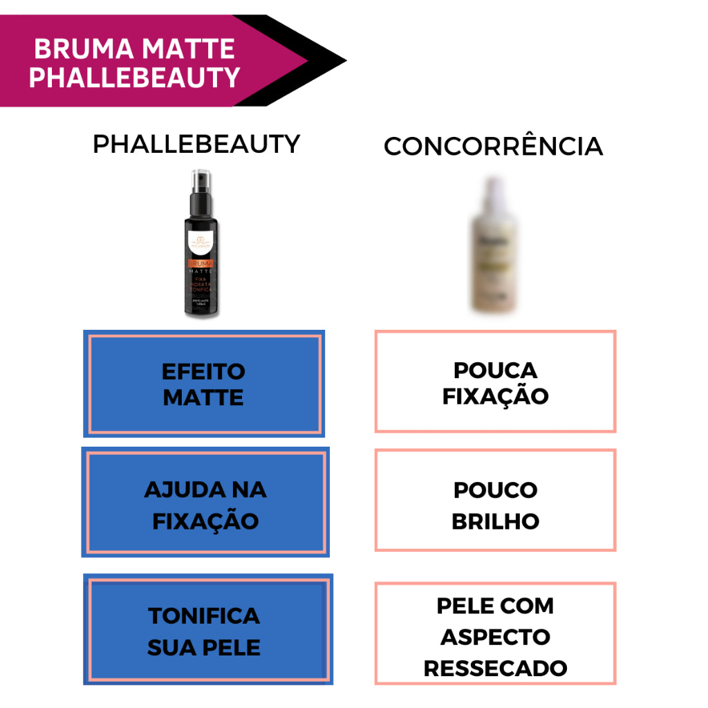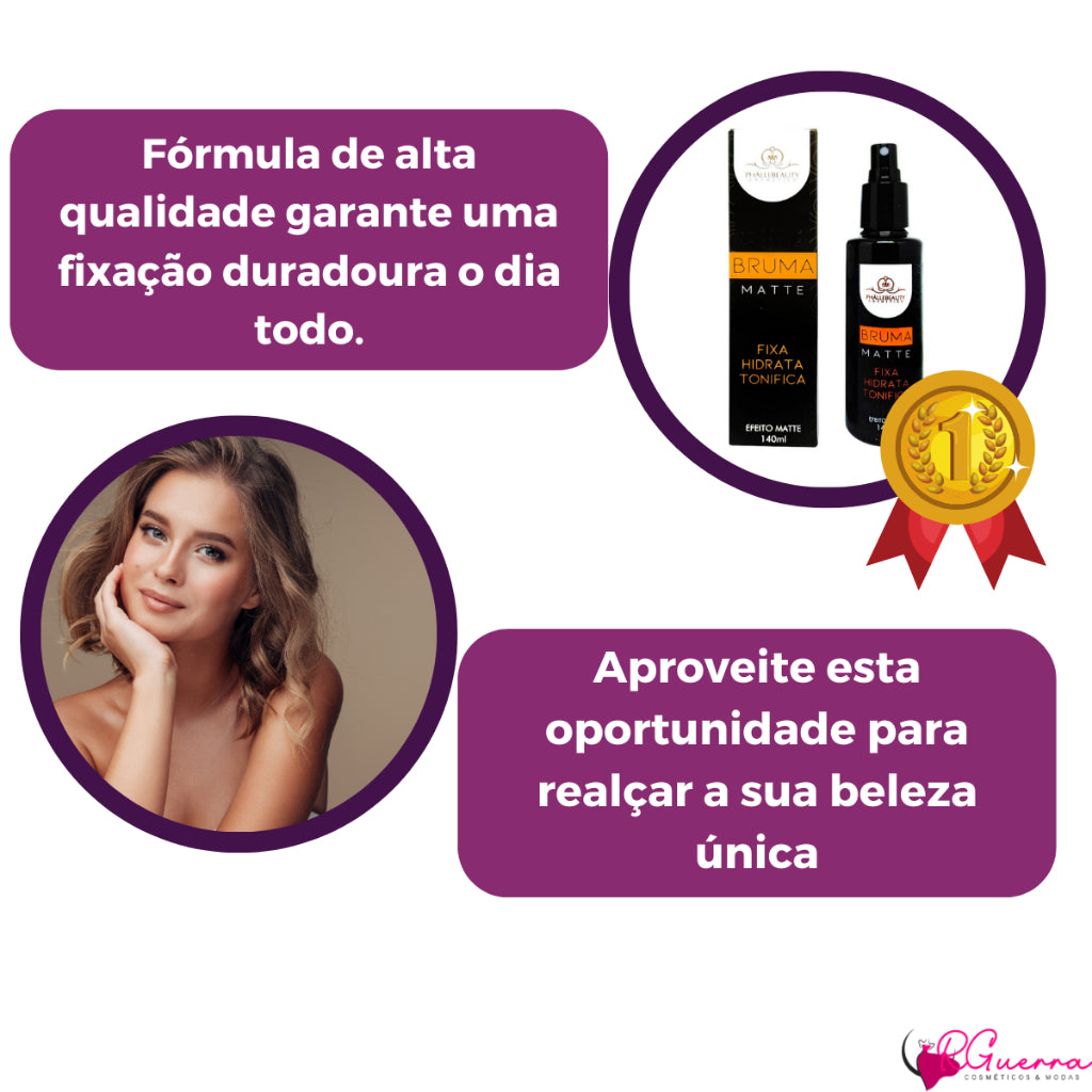 A Bruma Matte promove uma aparência natural da pele, além de oferecer uma proteção extra aos danos externos. Enriquecida com extratos de Aloe Vera, Algodão e Hamamelis, a Bruma Matte é indicada para preparar a pele, facilitando a aplicação e aumentando a fixação dos itens da make, além de promover uma pigmentação maior de produtos como pó e sombra