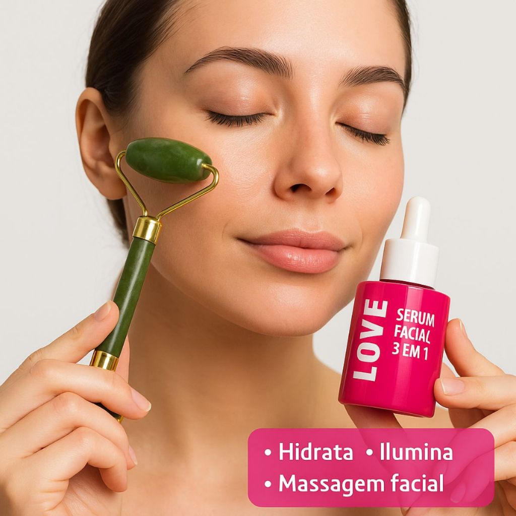 Kit Skincare – Sérum Facial Love 3 em 1 (30 ml) + Jade Roller• Sérum 3 em 1: hidrata, ilumina e deixa a pele macia (Vitamina C + Rosa Mosqueta + Ácido Hialurônico)• Jade Roller duplo em pedra jade natural: massageia, auxilia na drenagem e potencializa a absorção do sérum•