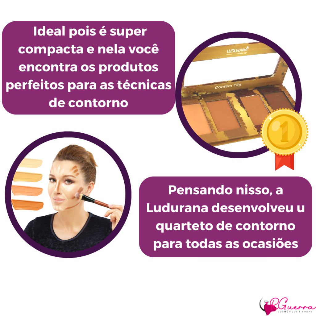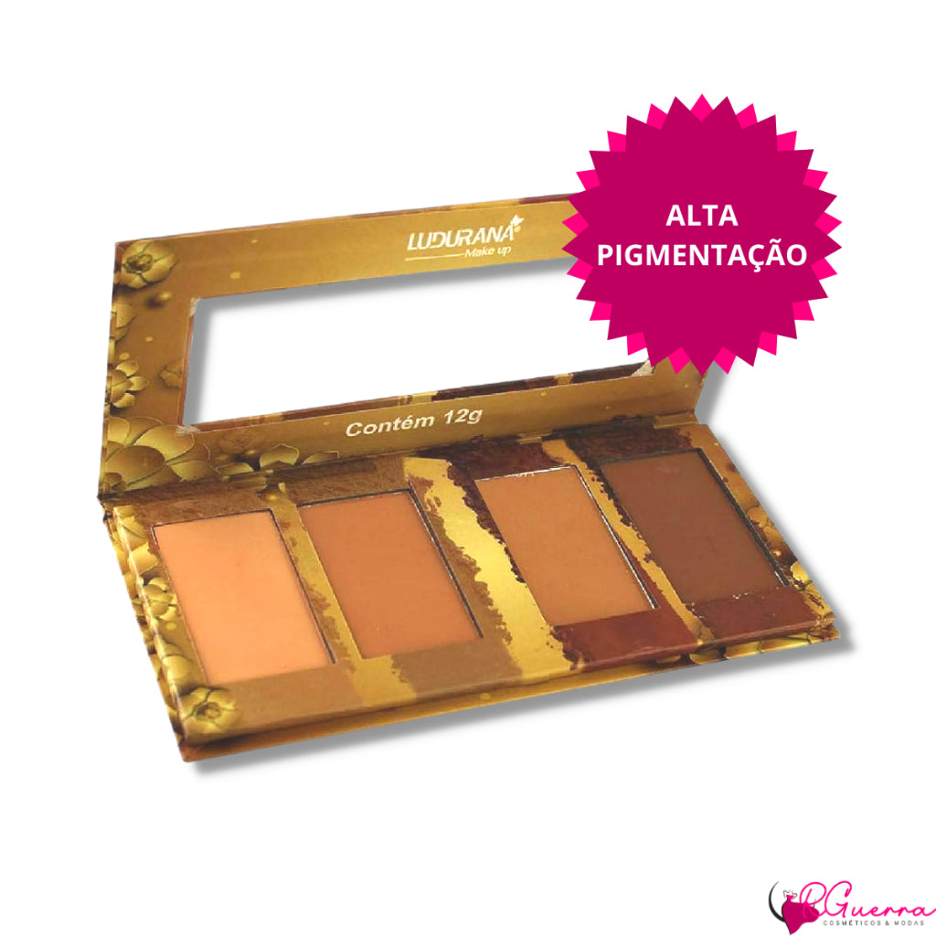 Características do produto : O quarteto de contorno Ludurana trás 04 cores lindas que permitem um contorno perfeito em todo tipo de pele.Iluminação e contorno são os truques que deixam a maquiagem mais bem acabada e sofisticada.Todos tem acabamento matte, alta pigmentação e esfumam bem.